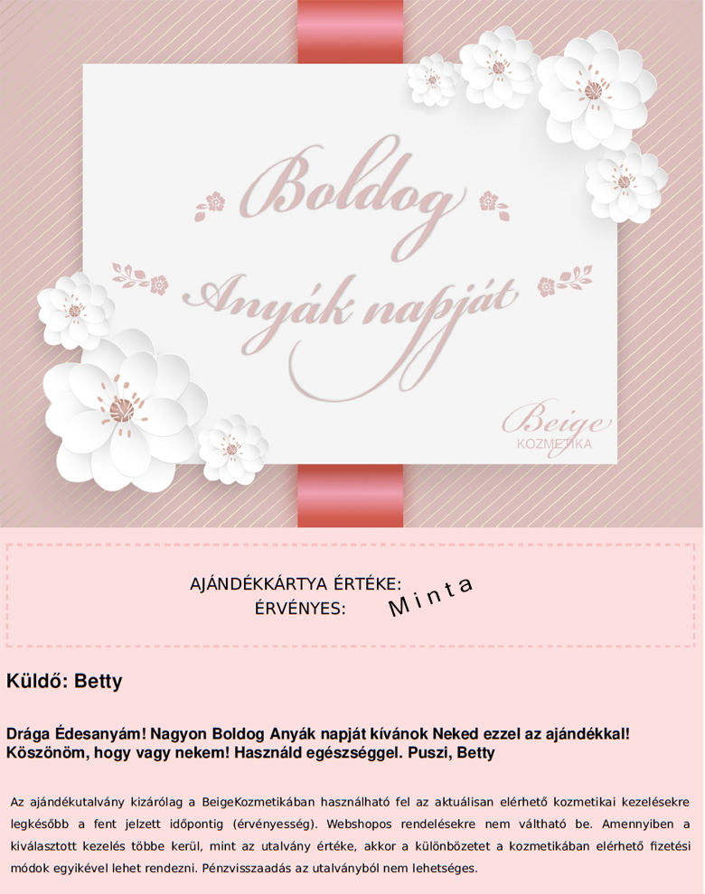 Az ajándékutalvány kizárólag a BeigeKozmetikában használható fel az aktuálisan elérhető kozmetikai kezelésekre legkésőbb az utalványon jelzett időpontig (érvényesség), ami a vásárlástól számított 6 hónap + 5 nap türelmi idő. Webshopos rendelésekre nem váltható be.